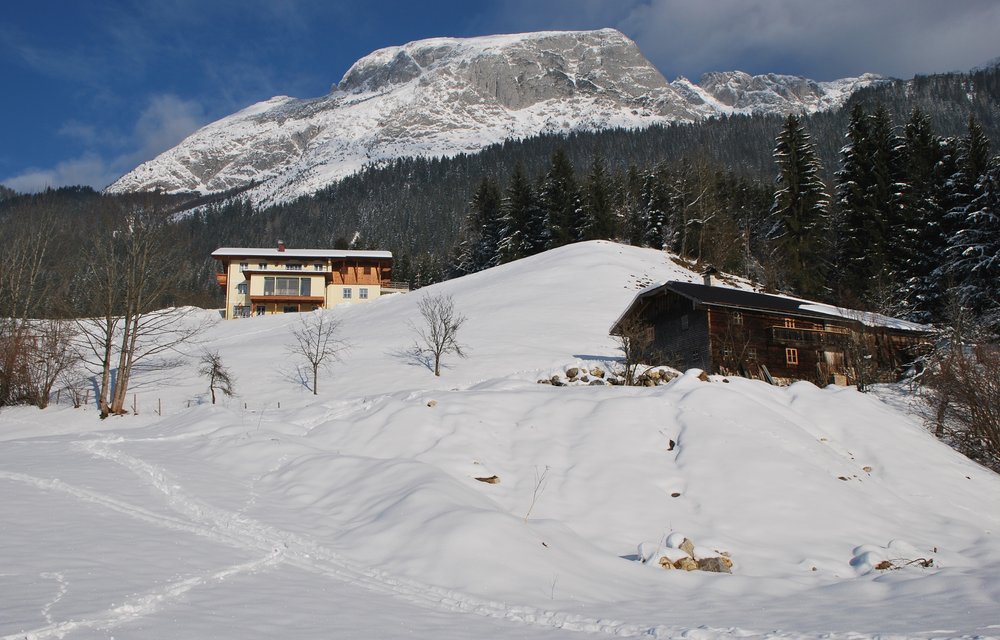 Tourenski-geher können direkt vom Haus aus starten. Hinter dem Haus geht es sofort nach oben zu den Almen.